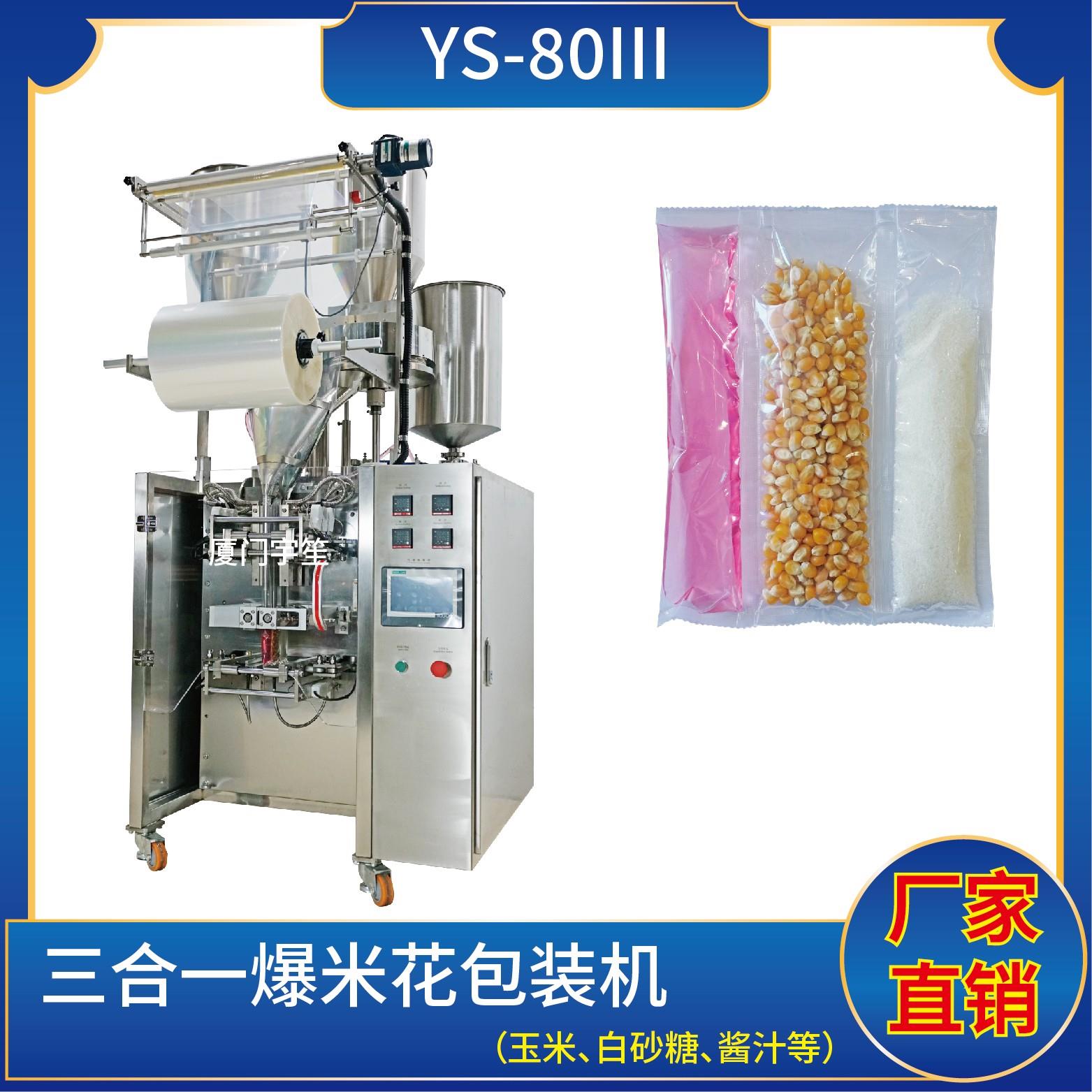 YS-80三列 三合一爆米花包裝機(使用鍍鋁、塑膠膜包裝)特點:1、適用于食品、醫(yī)藥、化工、化妝品行業(yè)中顆粒、粉劑、液體、醬料等物品的計量包裝。2、可自動完成制袋、計量、下料、封合、分切、計數(shù),可根據(jù)客戶要求配置打印批號等功能。3、觸摸屏操作,PLC控制,伺服電機控制袋長,性能穩(wěn)定、調(diào)整方便、檢測準確。智能式溫…
