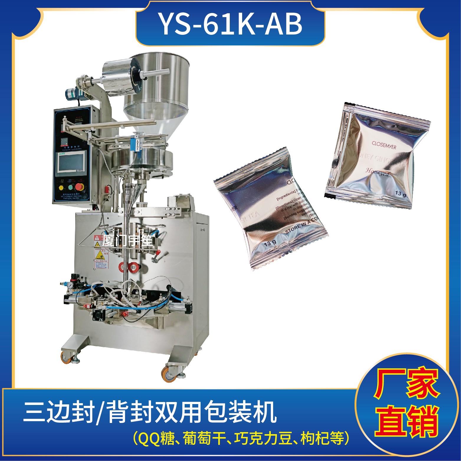 YS-61K-AB 三邊封/背封雙用包裝機特點1、適用于食品、醫(yī)藥、化工、化妝品行業(yè)中顆粒物品的計量包裝。2、可自動完成制袋、計量、下料、封合、分切、計數(shù)、且可根據(jù)客戶要求配置打印批號等功能。3、觸摸屏操作,PLC 控制,驅(qū)動步進電機控制袋長,性能穩(wěn)定、調(diào)整方便、檢測準確。智能式溫控儀,PID調(diào)節(jié),保證將溫度的誤差范圍…