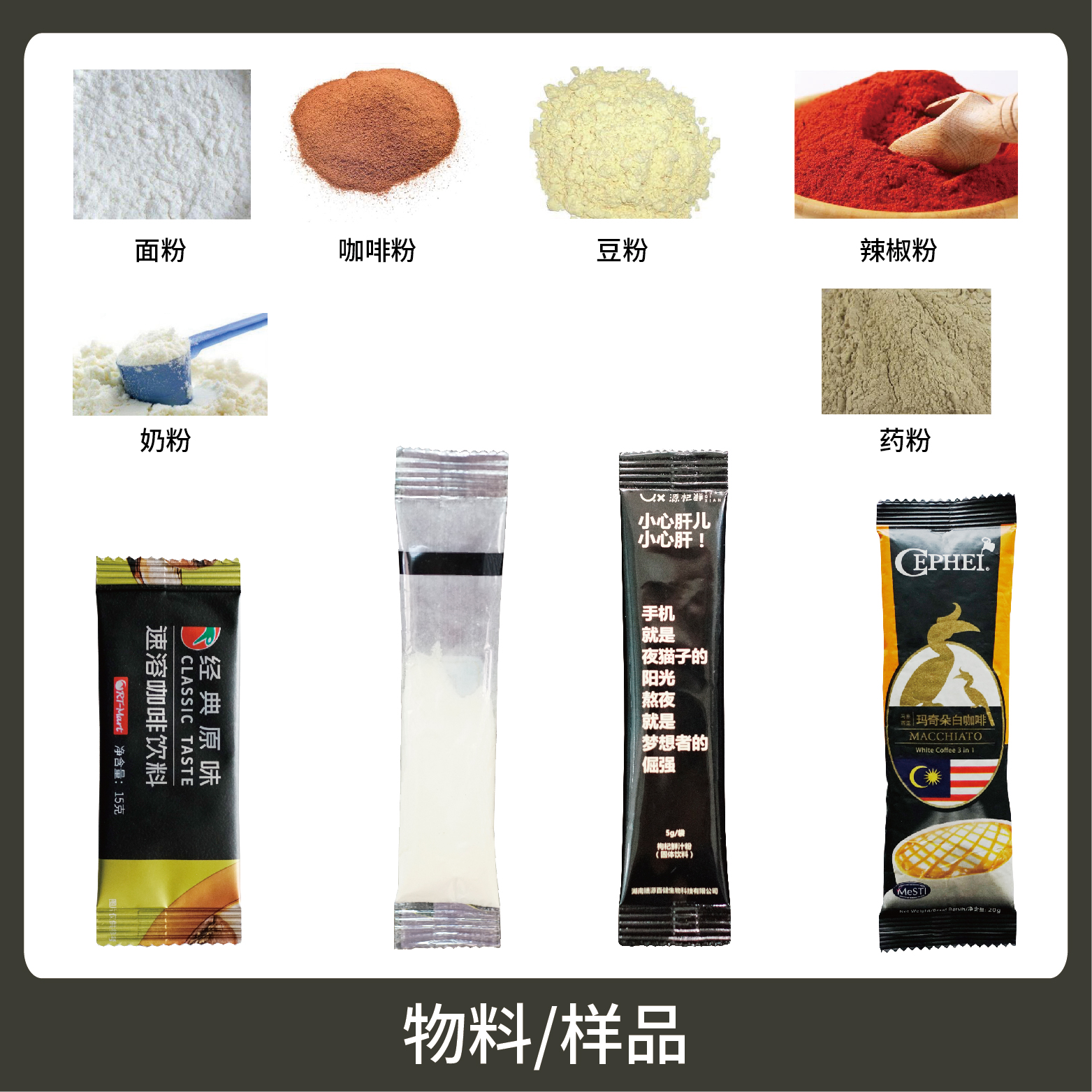 適用于食品、醫(yī)藥、化工、化妝品行業(yè)中粉劑物品的計(jì)量包裝,如:鹵料粉、奶粉、蛋白質(zhì)粉、咖啡粉等。