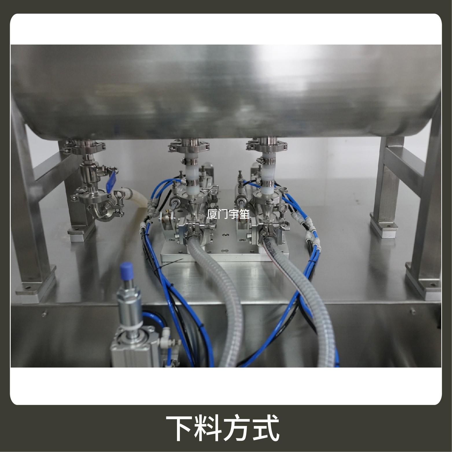 2、成品雙出,速度快,包裝流程全自動、無需人工操作??筛鶕?jù)充填物料的性質(zhì)選配不同的下料結(jié)構(gòu)